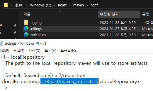 maven의 레포시토리를 해당 폴더에 저장하고 싶으면 maven 해당 주소의 settings에 들어가서 다음과 같이 수정한다.