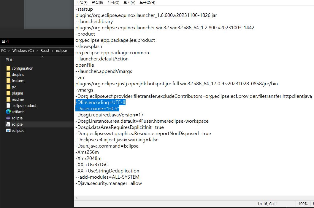 이클립스의 eclipse.ini 를 열고 해당 구문을 추가한다. 모든 파일을 UTF-8 형식으로 하겠다는 뜻. 그리고 닉네임은 본인이 원하는 닉네임으로 설정하면 된다.