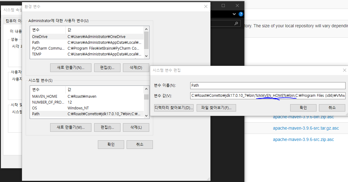 찾기에 시스템 환경 변수 편집에 들어가서 저 두개가 있는지 확인하고 없으면 새로 만들기로 추가