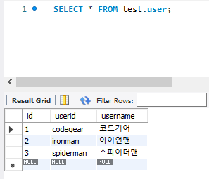 해당 사이트의 코드들을 붙여넣기 해서, 본인의 mysql 정보(비밀번호, 데이터베이스 등등)를 수정하고 원하는 쿼리문을 작성한다. SELECT문을 적었을 시, 모든 데이터의 값들이 조회되는 것을 확인할 수 있다.