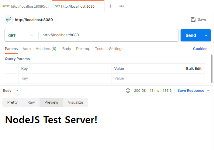 다운로드한 Postman에 가서 http://localhost:8080 을 get 방식으로 전송하면 write.response로 불러올 값이 불러와지는 것을 확인할 수 있다.