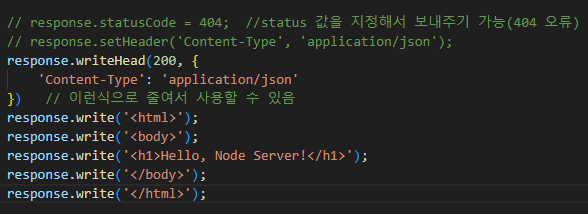 response.writeHead는 위의 두 코드를 간단하게 줄여서 사용이 가능하다.