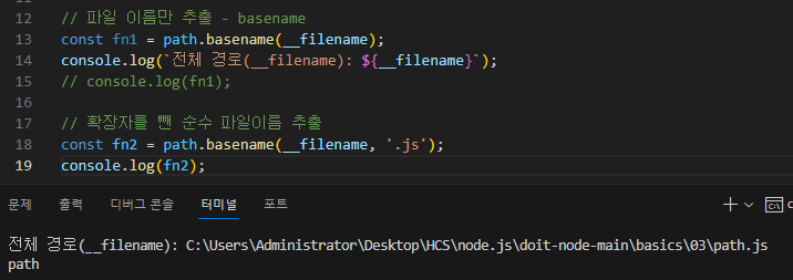 현재 코드를 작성하고 있는 js 파일을 불러오기 위해 "__filename" 을 이용했다. 만약 파일 이름만을 추출하고 싶다면,
