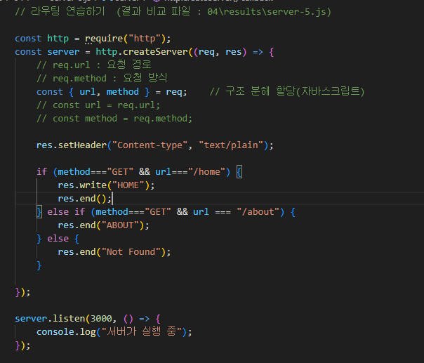 req 요청 부분에는 url과 method가 포함되어 있는데, 그것을 변수에 담았다. 해당 메서드가 get이고 url이 /home 일 경우