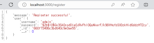 아이디와 비밀번호를 'admin'으로 등록해봤다. 패스워드가 'admin'이 아닌 암호화 되어 있는 걸 확인할 수 있다.