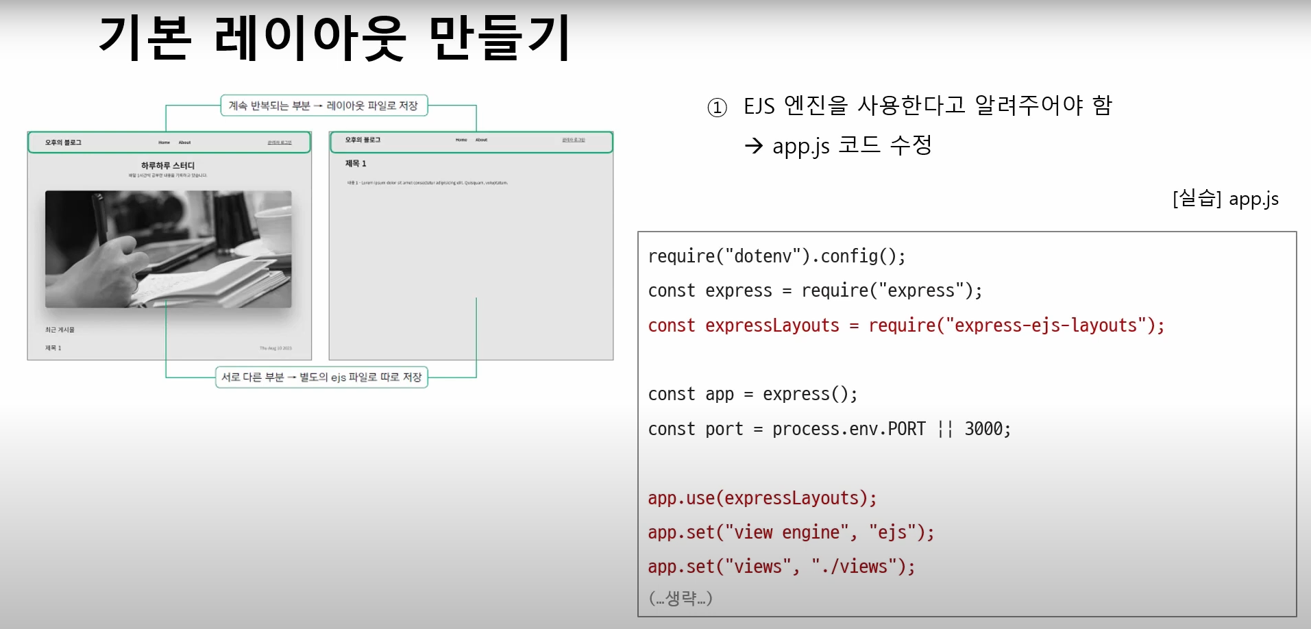 애플리케이션에 가서 레이아웃을 사용하겠다고 선언하고, 템플릿 엔진을 ejs로, views 파일 경로를 사용할 것