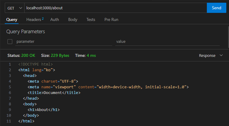 라우트파일에서 다음과같이 코드를 작성하면, 서버를 돌린 결과 해당 주소를 달리하면 레이아웃은 똑같고 body 부분의 태그만 변경되는 것을 확인할 수 있다.
