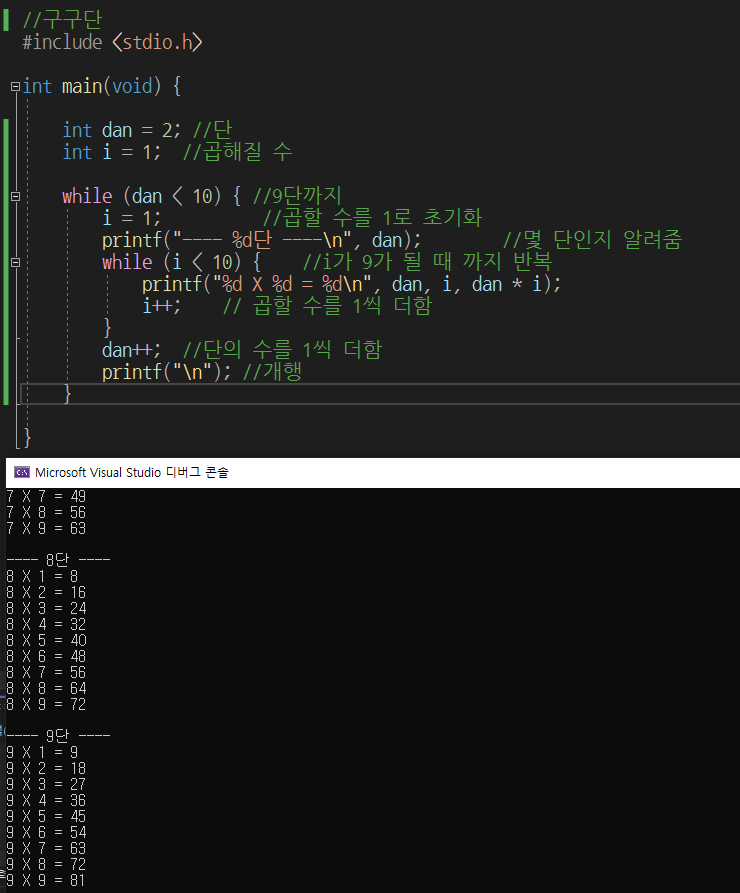 설정해놓았다. 그리고 두번째 while문에는 곱할 수가 9가 될 때까지 반복하도록 설정했다.