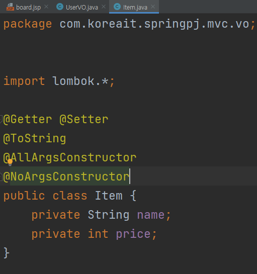 Item 이라는 클래스를 만든 뒤, getter, setter, 생성자, ToString 모두 생성