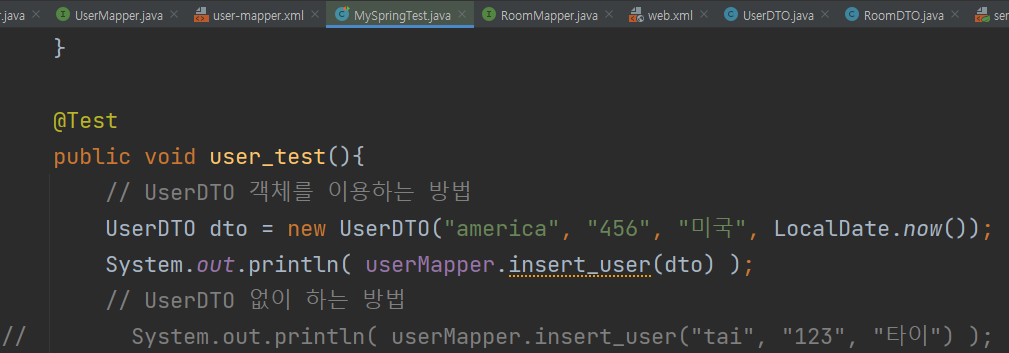 UserDTO 객체를 이용하는 방법과 이용하지 않는 방법이 있다. UserDTO를 이용한다면, 생성자 때문에 마지막에 default 처리되어 있는 registDate 파라미터 역시 넣어야 한다. 하지만 UserDTO 없이 한다면, registDate는 now()로 default 처리 되어 있기 때문에 굳이 파라미터를 적을 필요가 없다.