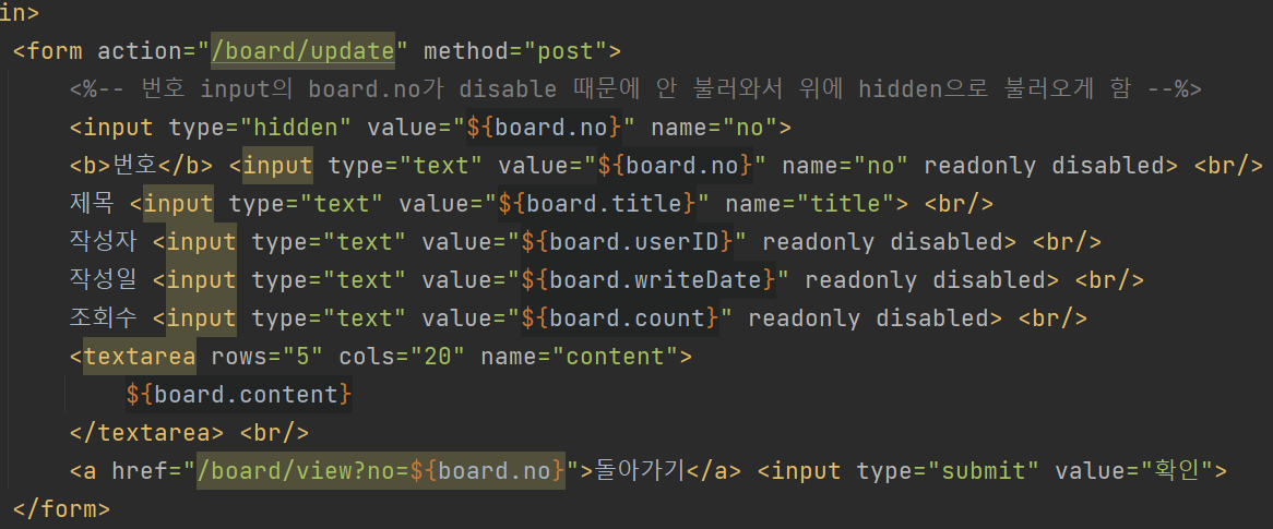 게시물 수정과, 게시물 삭제, 다음과 같이 수정 페이지에서 수정한 값들을 insert 문으로 매칭한 메소드를 불러와서 DB내용을 변경하는 방식으로 수정이 되도록 하였다. 게시물 삭제는 간단하다. 그냥 해당 게시물의 'no'를 불러와서 delete 문으로 매칭한 메소드를 이용하여 삭제를 진행.