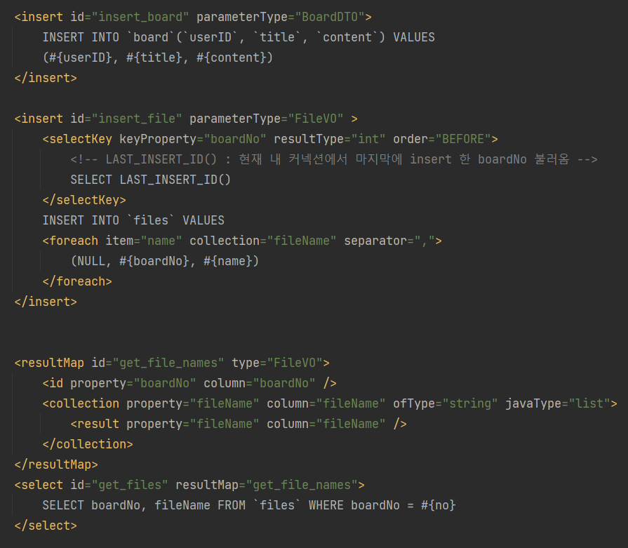 새로운 게시물의 파일들을 insert하는 쿼리문과, 전달받은 no의 게시물을 전부 가져오는 역할의 select문을 작성